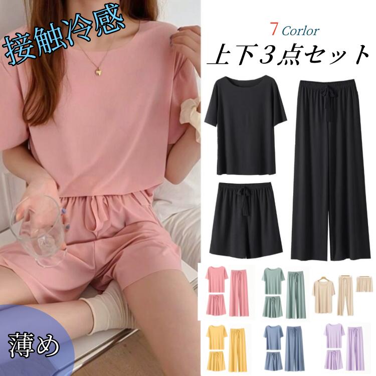 パジャマ ルームウェア 無地 接触冷感上下 セット 半袖 Tシャツ 長パンツ ロングパンツ ショートパンツレディース ゆったり寝間着 シンプルフリーサイズ ネグリジェ ガウン ナイトウ ホームパジャマ