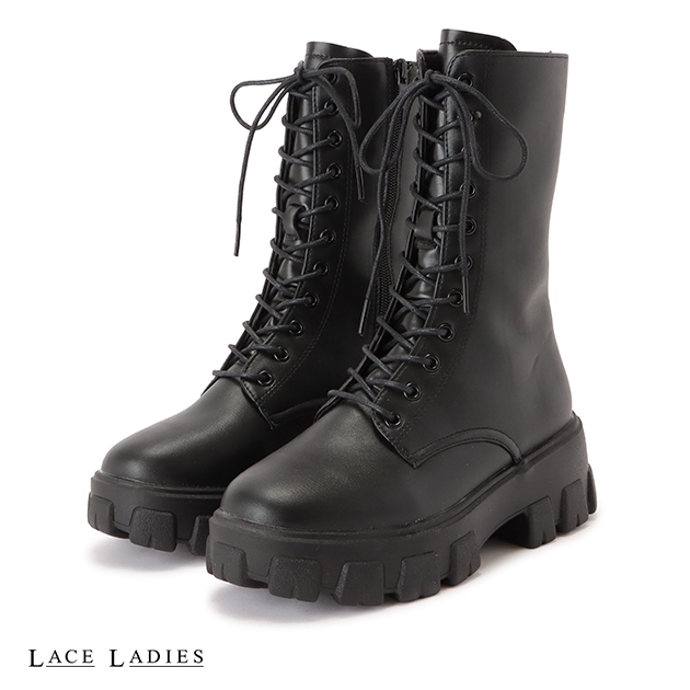 厚底 レースアップ ミドルブーツ PUレザー 編み上げ ラウンドトゥ レディース ヒール 春 秋 冬 美脚 脚長 ごつめ トラックソール カジュアル ストリート きれいめ 韓国 ブラック ボーイッシュ