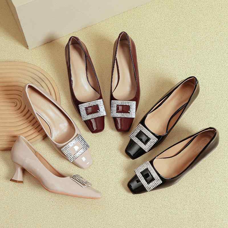 パンプス レディース スクエアトゥ 浅口 ミドルヒール 細ヒール ラインストーン スクエアバックル エナメル素材 ワインレッド ブラック ベージュ フレンチスタイル きれいめ オフィス 通 エレガント