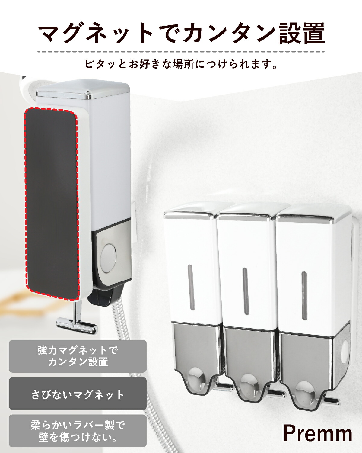 PREMM マグネット 壁掛け シャンプーディスペンサー 550ml×3本 550ml×2本 大容量