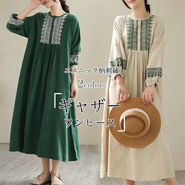 ロングワンピ レトロ ハイウエスト エスニック柄 ギャザーワンピース 長袖ワンピース レディース 体型カバー