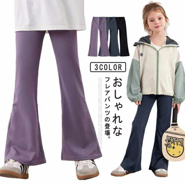 キッズパンツ ストレッチ 裾フレア ロングパンツ フレアパンツ キッズ 子供 女の子 パンツ ボトムス 長ズボン 無地 伸縮性 シンプル カジュアル 美脚シルエット 子供服 春 秋 スポーツ おしゃれ