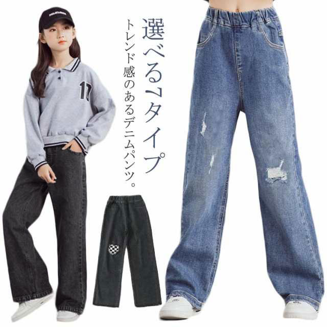 ストレート カジュアル キッズ 女の子 デニム ジーンズ パンツ 子供服 ロング丈 ジュニア ガールズ ワイドパンツ ウェストゴム ポケット付き ヒップホップ オールシーズン シルエット ダンス衣装