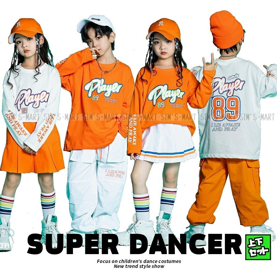 キッズダンス衣装 セットアップ Tシャツ スカート パンツ ガールズ ヒップホップ 男の子 ダンス衣装 派手 K-POP オレンジ 白 バックプリント 韓国