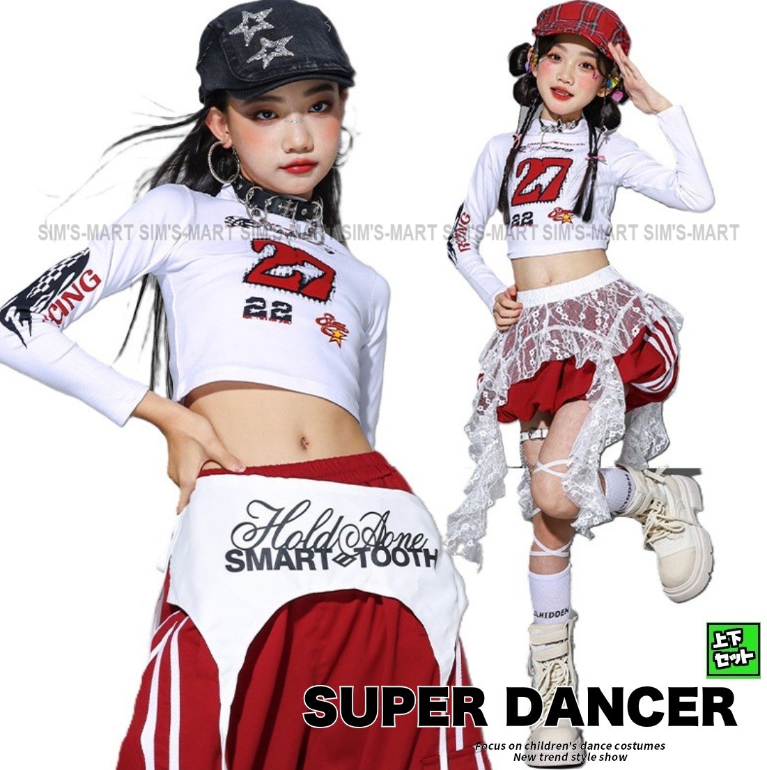 ガールズ ヒップホップ 衣装 白 赤 K-POP 韓国 チアダンス 子供ダンス服 ダンスウェア へそ出し ラインパンツ バルーンスカート キッズダンス衣装 トップス