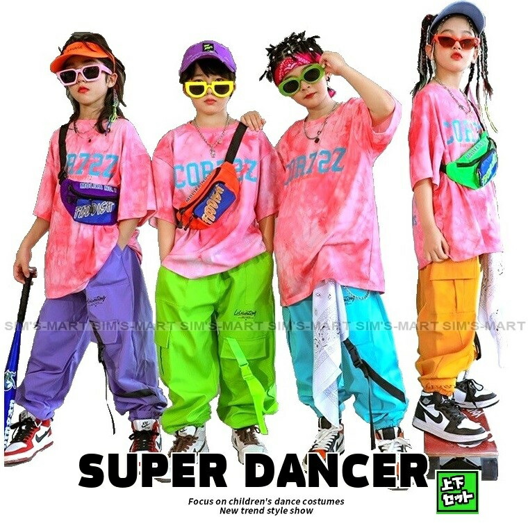 キッズダンス衣装 セットアップ ヒップホップ ファッション ダンス衣装 男の子 ガールズ Tシャツ パンツ タイダイ柄 派手 K-POP 韓国 ピンク 黄緑 黄色 水色 紫
