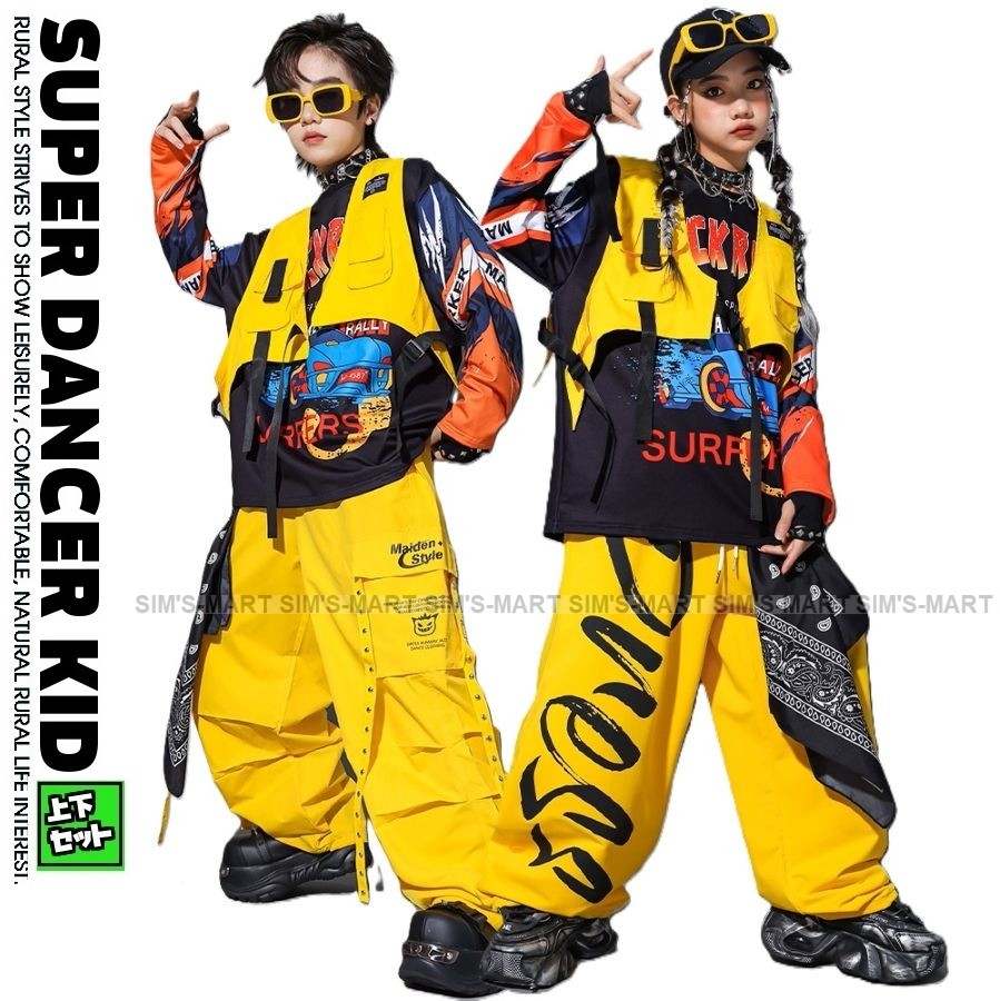 キッズダンス衣装 セットアップ ヒップホップ 衣装 黒 黄色 オレンジ K-POP 韓国 派手 子供ダンス服 ダンスウェア ナンバリング パンツ ダンス衣装 キッズ Tシャツ