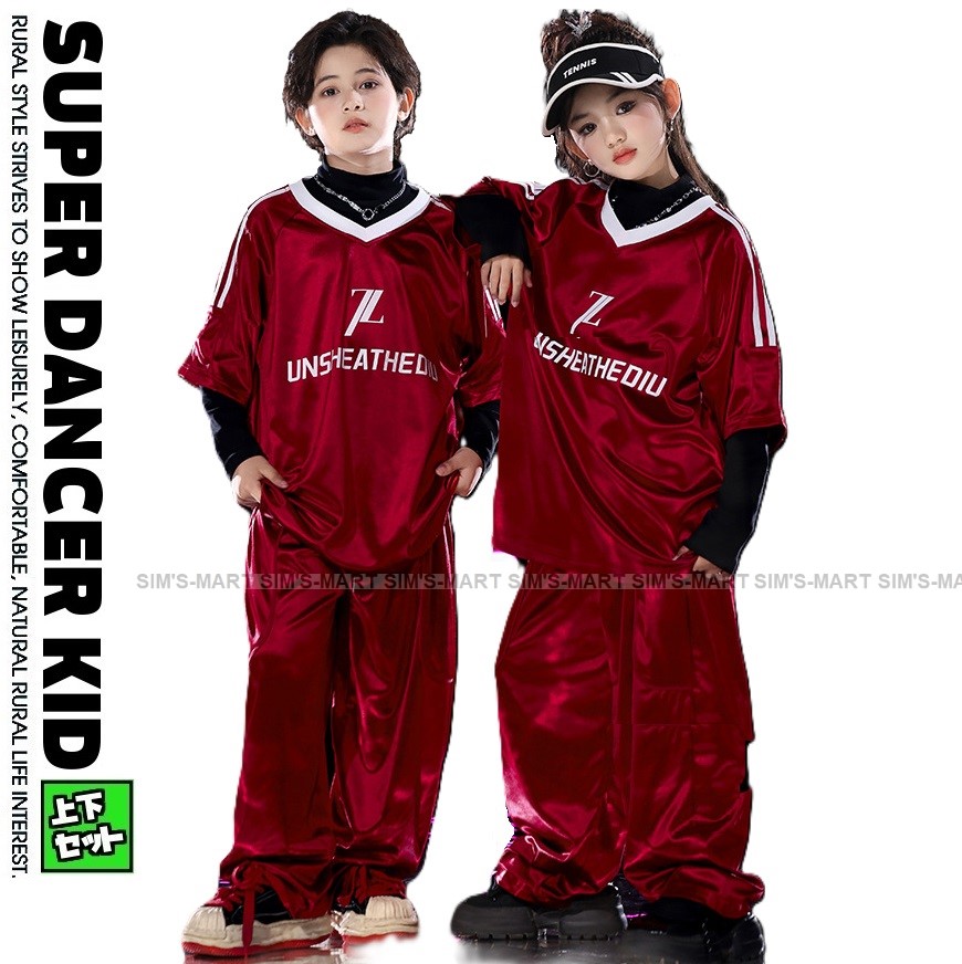 キッズダンス衣装 セットアップ ヒップホップ ファッション ダンス衣装 キッズ 派手 男の子 ガールズ サッカー Tシャツ ユニフォーム風 ワインレッド 赤 パンツ