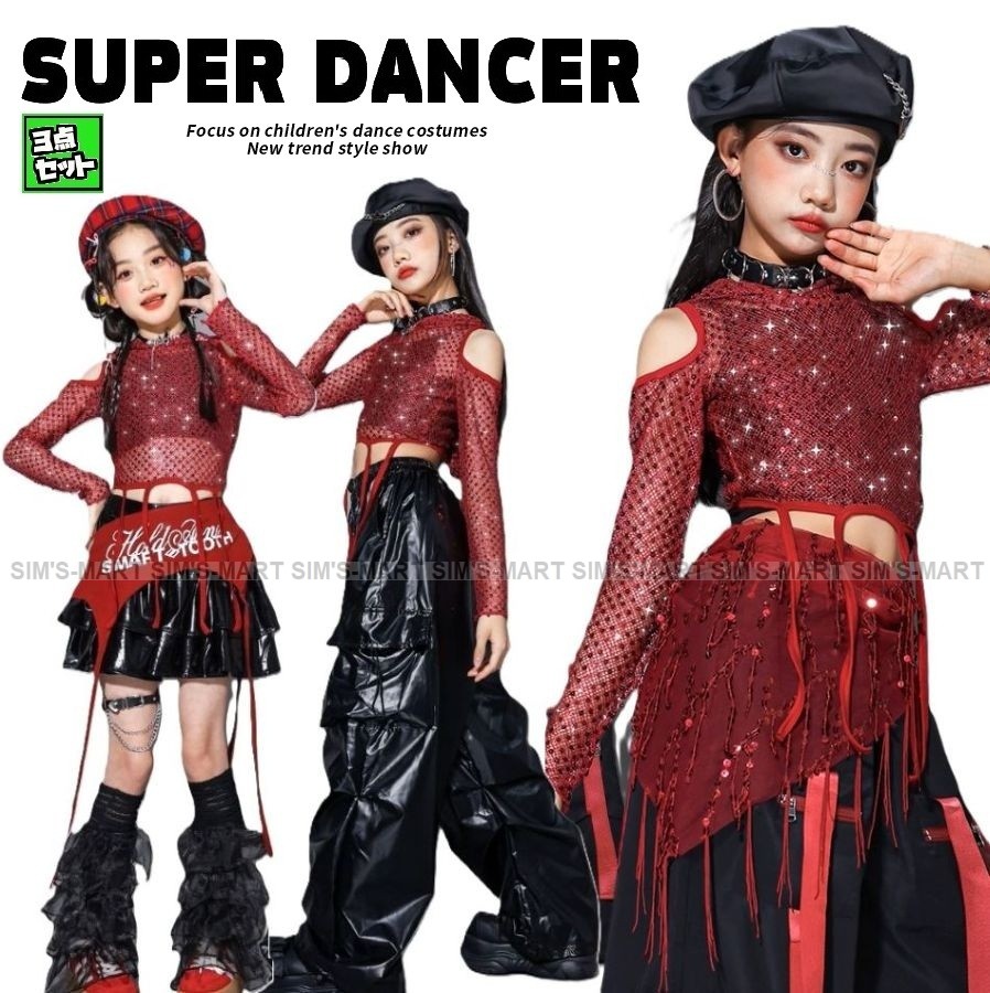 ダンス衣装 ガールズ 衣装 かっこいい 赤 レザー K-POP 韓国 セットアップ へそ出し トップス 子供ダンス服 ダンスウェア キッズダンス衣装 パンツ