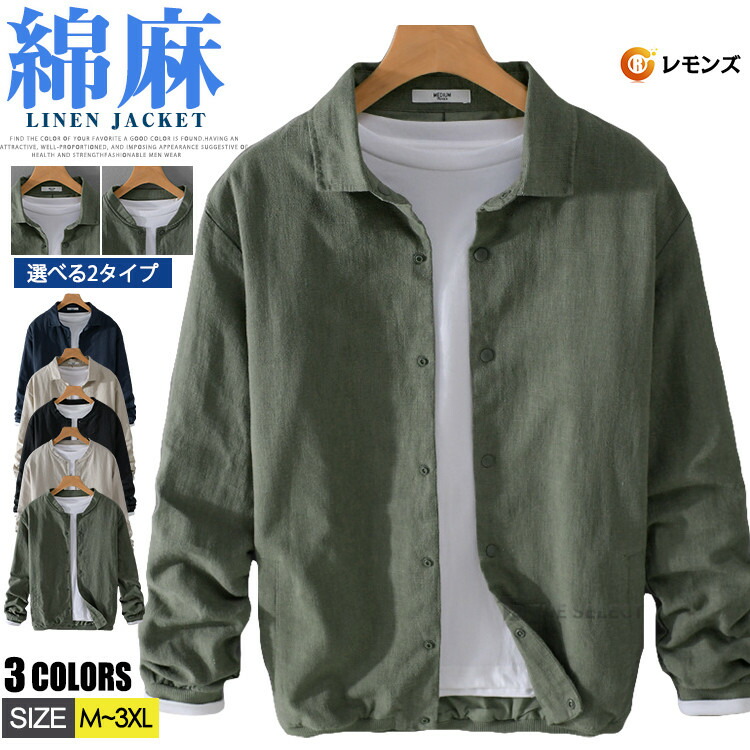 麻 ジャケット メンズ 綿麻 リネンジャケット MA1 スタジャン サマージャケット 長袖 スナップボタン 無地 春夏 春物 コーチジャケット リネンジャンパー 折襟 シャツジャケット ビジ アウター