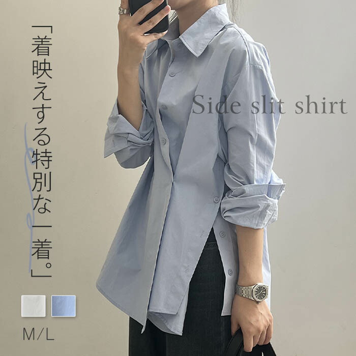 綿100% シャツ ブラウス レディース コットン 長袖 春秋 トップス シャツブラウス 長袖シャツ 羽織り 体型カバー サイドスリット ボタン フォーマル オフィス カジュアル アシメ