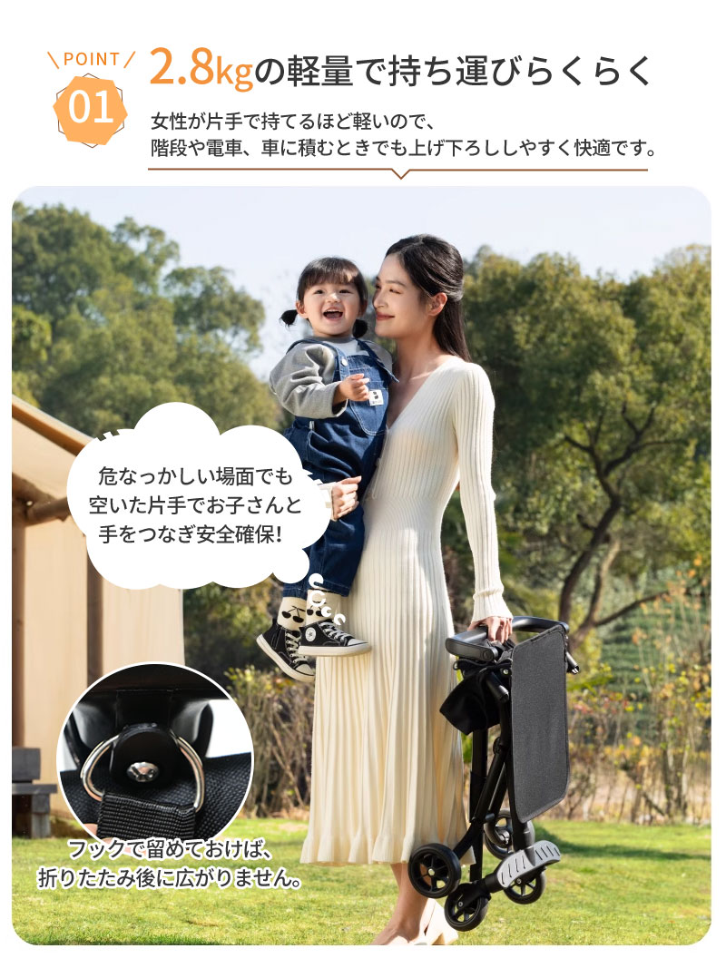 わずか2.8kgの超軽量設計!折りたたんでコンパクトに収納でき、旅行や外出時の持ち運びに便利です。