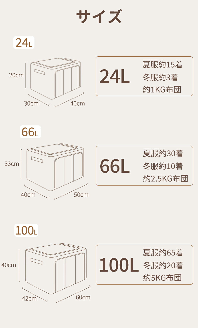 -サイズ展開:24L/66L/100Lの大容量で、衣類、毛布、雑貨、おもちゃ、本など様々な物を収納可能。
