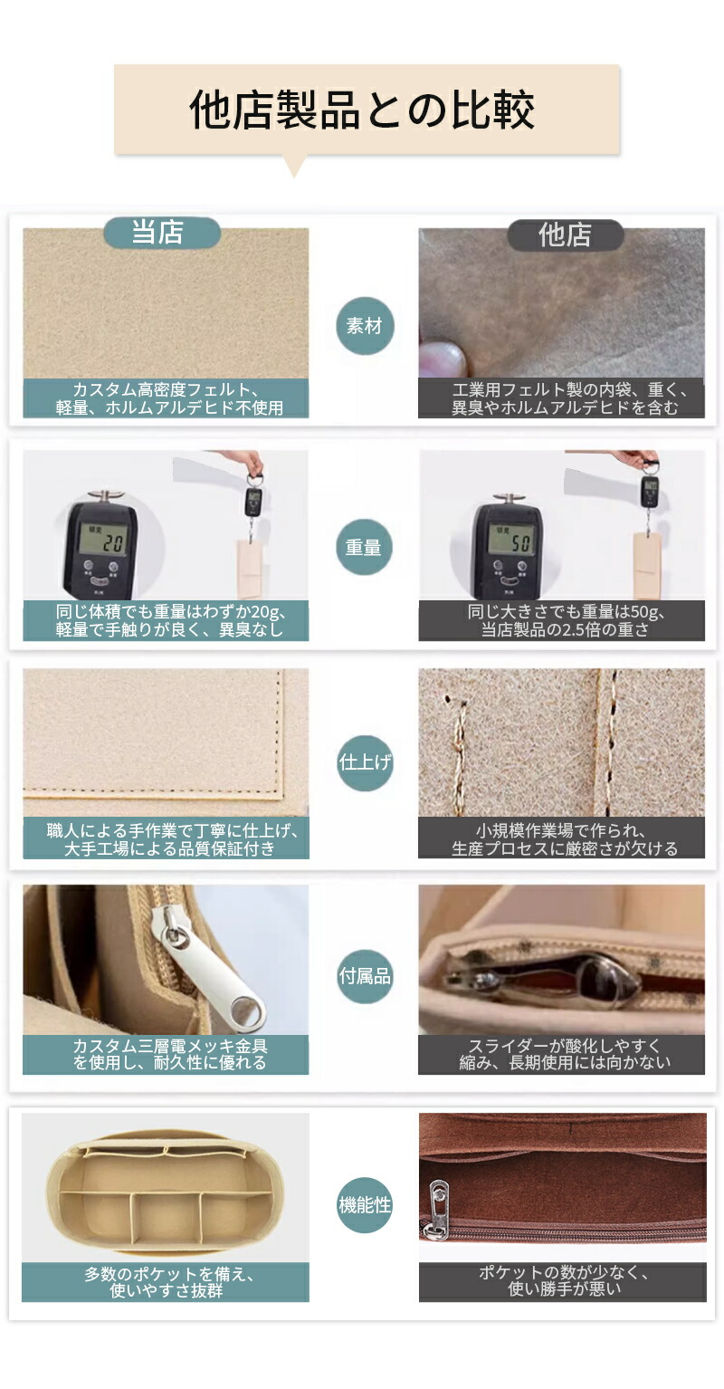 100%オリジナルポリエステルフェルトを使用し、色落ちせず、丈夫で傷つきにくい。軽量で肌に優しく、バッグの中身も守ります。