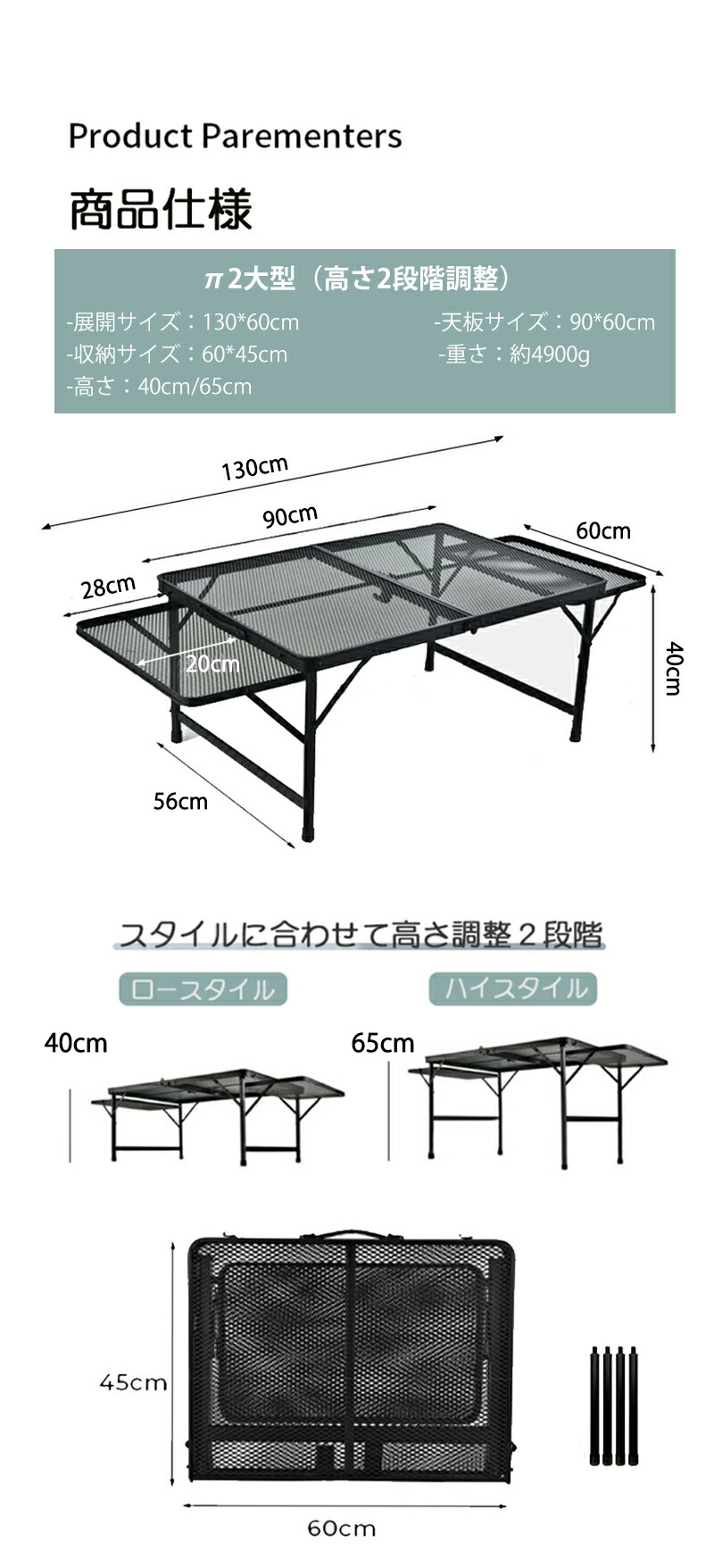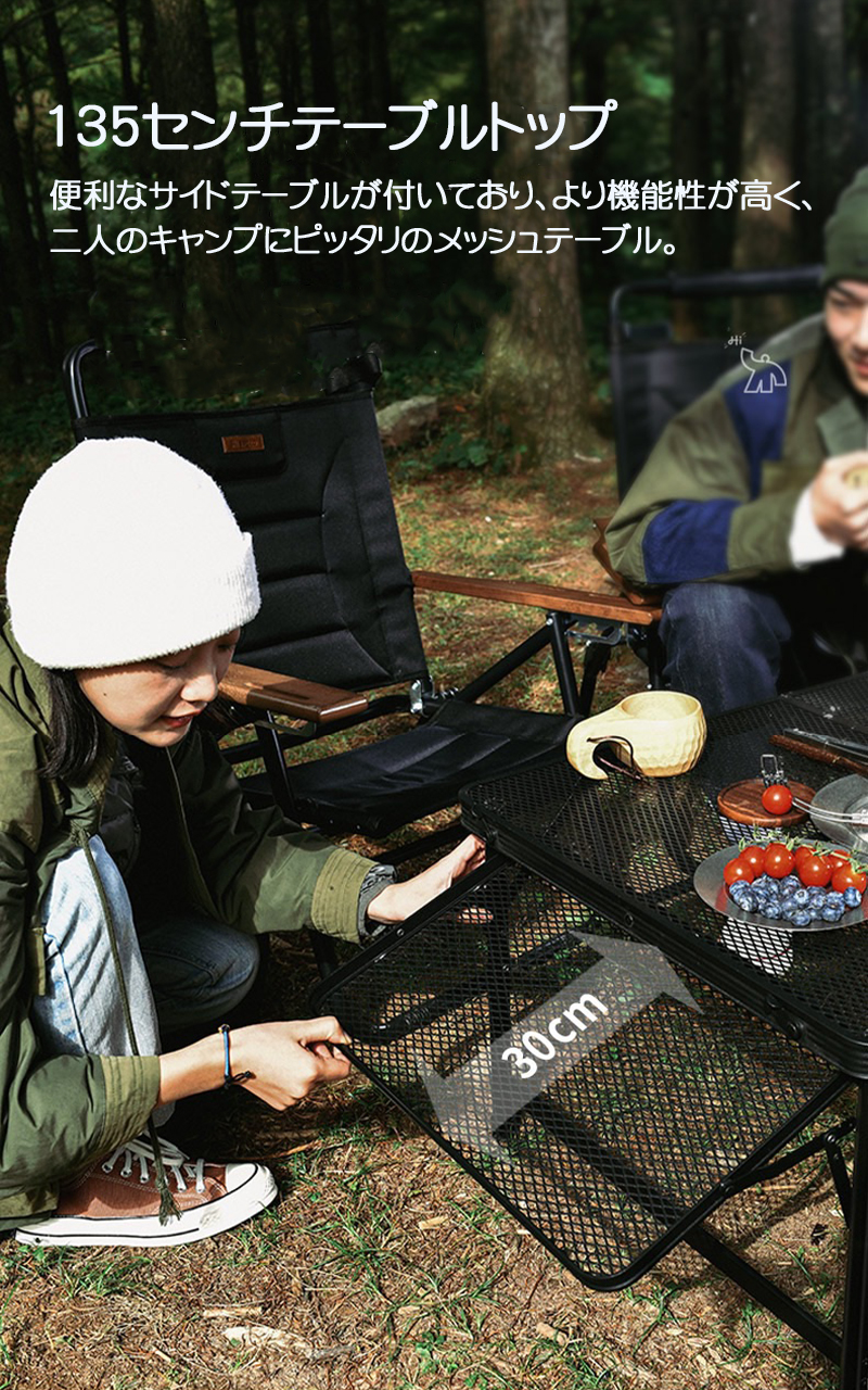 アウトドア テーブル 耐荷重50kg 135*60cm 収納袋付き 二つ折り メッシュテーブル 軽量 折りたたみテーブル 折り畳みテーブル スチール キャンプ用品 BBQ 高さ調整 キャ バーベキュー