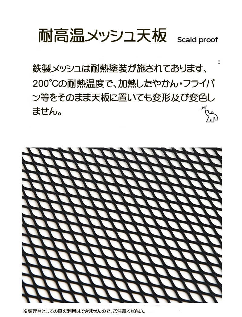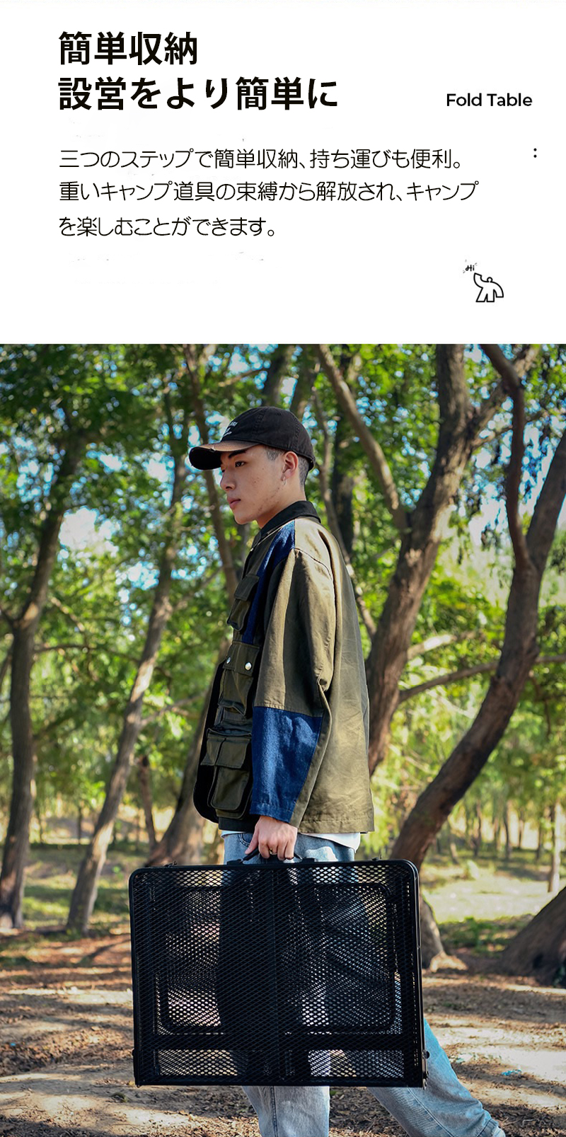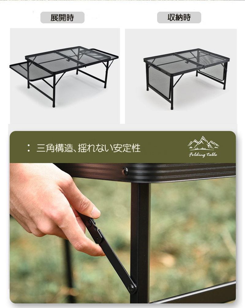 二段折りのデザインで、簡単かつ効率的に収納でき、実用性をより高めたアウトドアアイテム。熱い料理器具やコップなどを置いても安心して使えます。