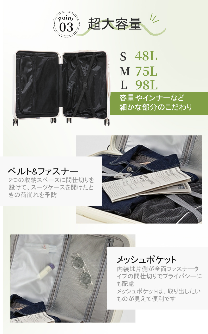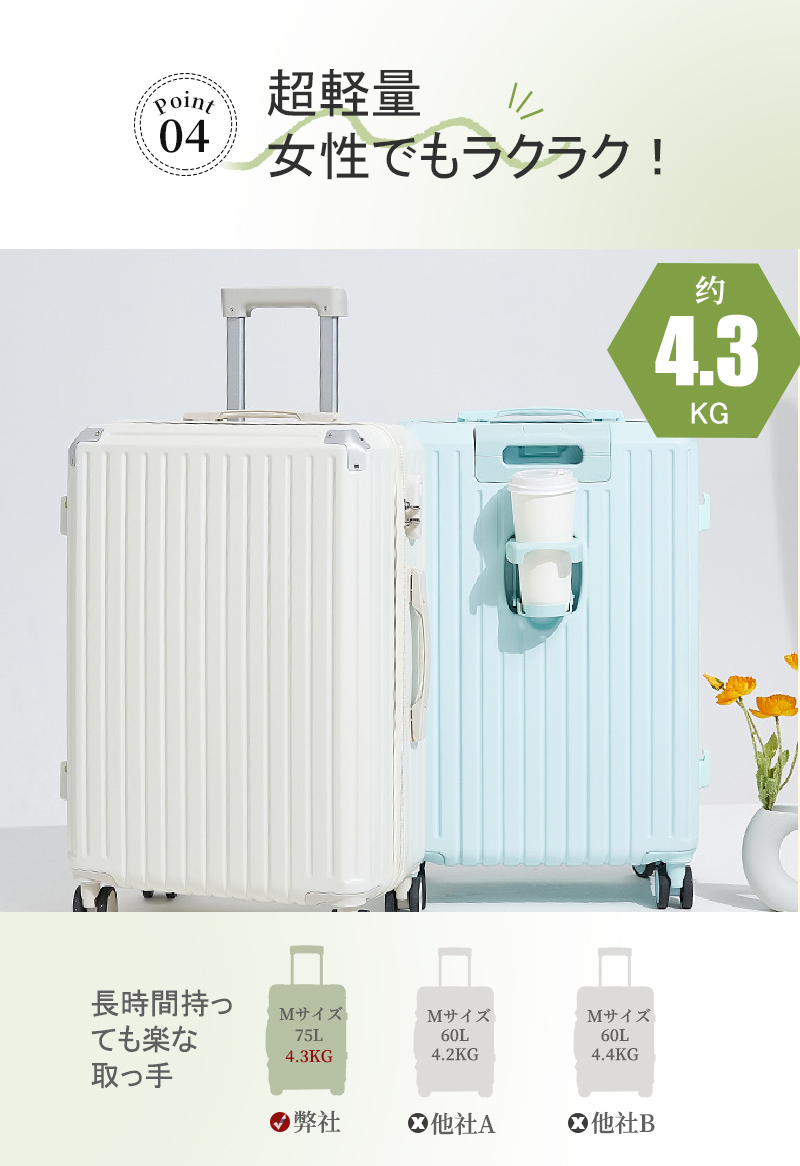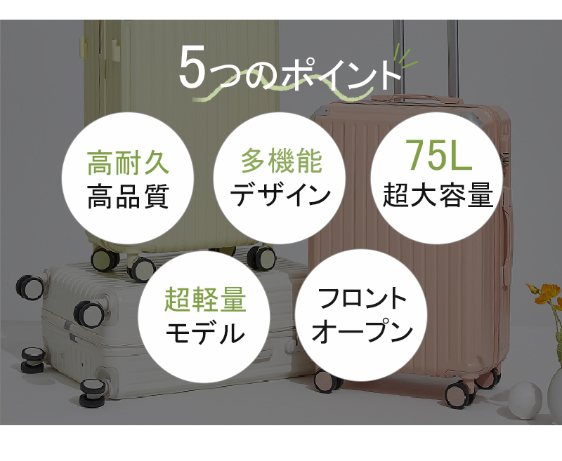 スーツケース キャリーケース 75L mサイズ 軽量 大容量 機内持ち込み ドリンクホルダー 静音 おしゃれ 小型 かわいい キャリーバッグ トランクケース sサイズ ダブルキャスター usbポート付き 3泊4日 S/M/Lサイズ ファスナータイプ ダブルキャスター