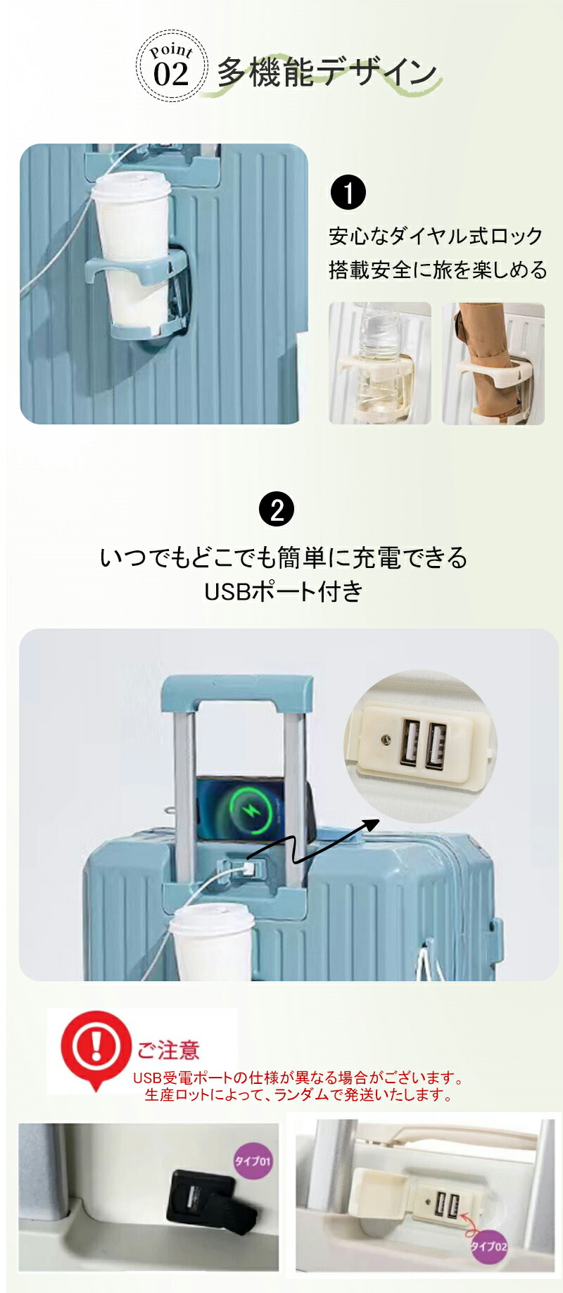 スマホなどの充電用にUSBポートを装備、旅行をより便利!