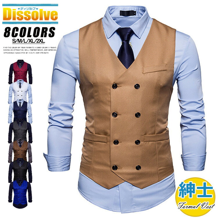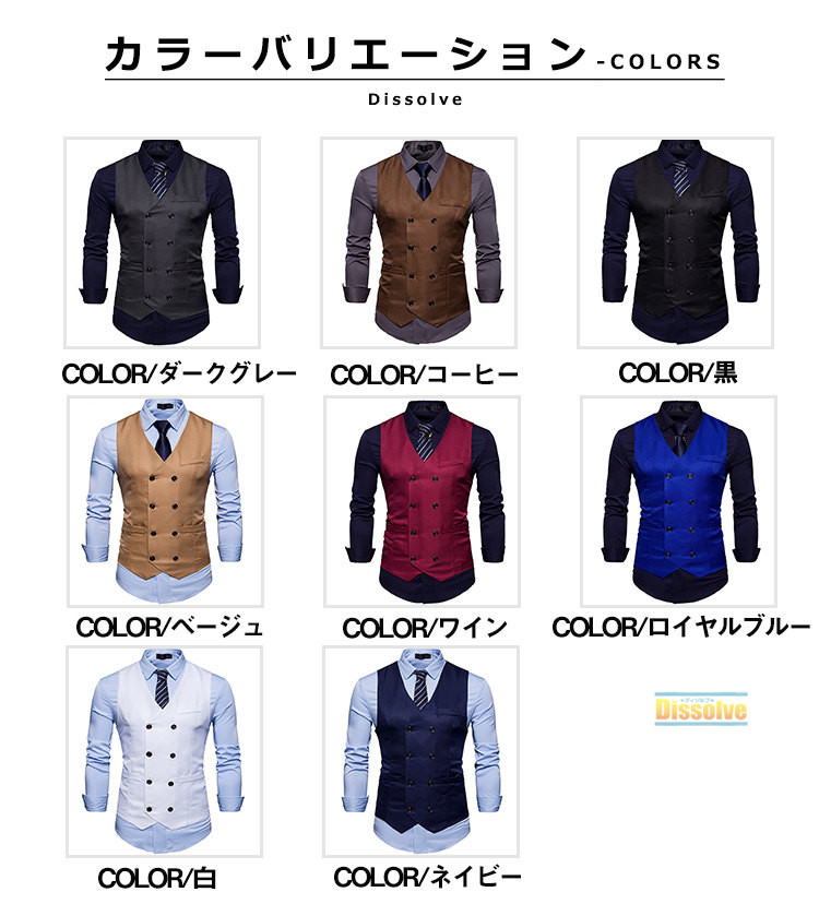 ジレベスト メンズ ベスト ダブル V トップス ベスト ジレ 豊富な品揃え S M L XL 2XL ダークグレー コーヒー 黒 ワイン ロイヤルブルー 白 ネイビー