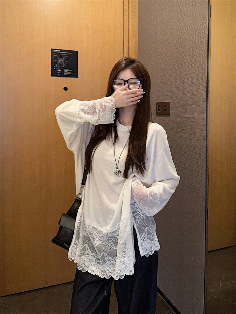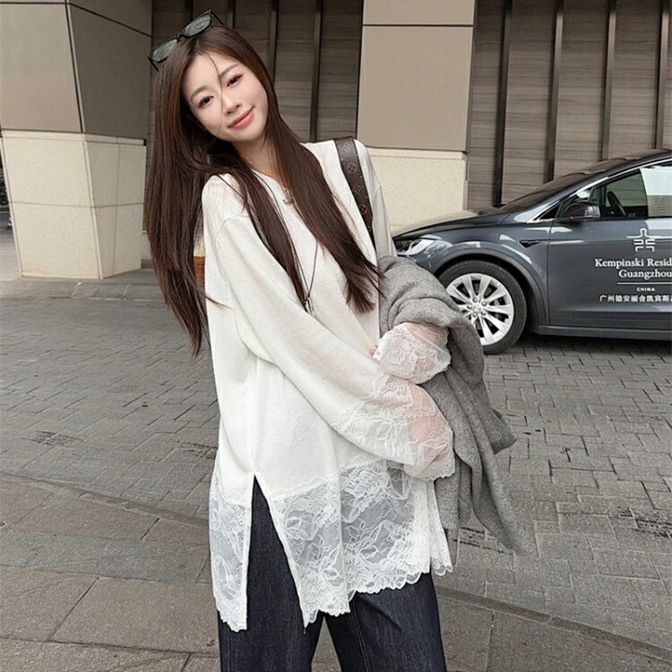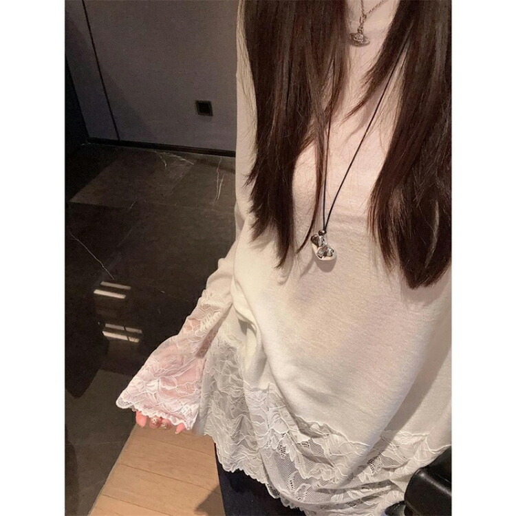 長袖 tシャツ 裾フレア レース切り替 トップス Tシャツ カットソー 人気 M L XL 2XL
