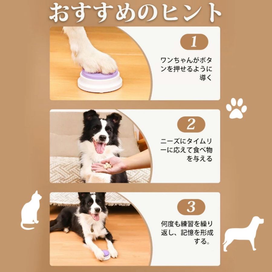 数量: 4/6/10個[録音可能なボタン] - ペットボタンの会話コミュニケーション用に設計されたドッグボタンは、音声をクリアに録音し、スムーズに再生できます。 合計録音時間は最大 30 秒です。 「肉」、「水」、「出て!」、「含めて」などの個別に記録されたコマンドは、ペットの発話をサポートします。 短いサイレンサーで気になる音を録音し、再生ボタンを押していつでも録音した音を変更できます。 日本語の取扱説明書が付いているので、初心者でもペットに使い方を簡単に教えることができます。