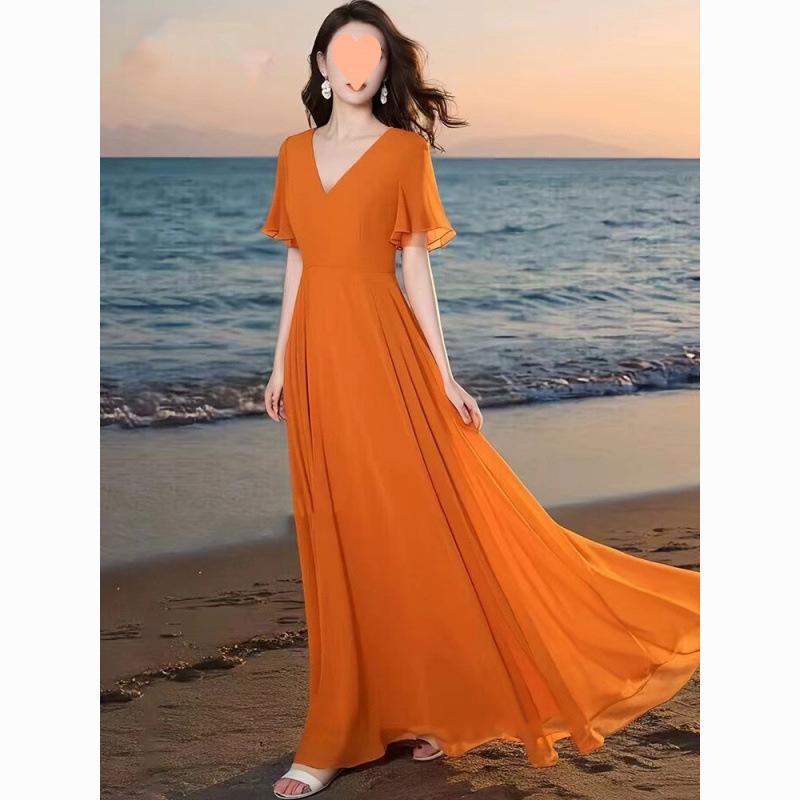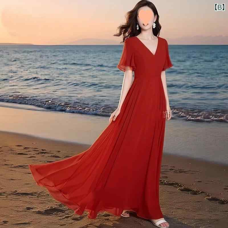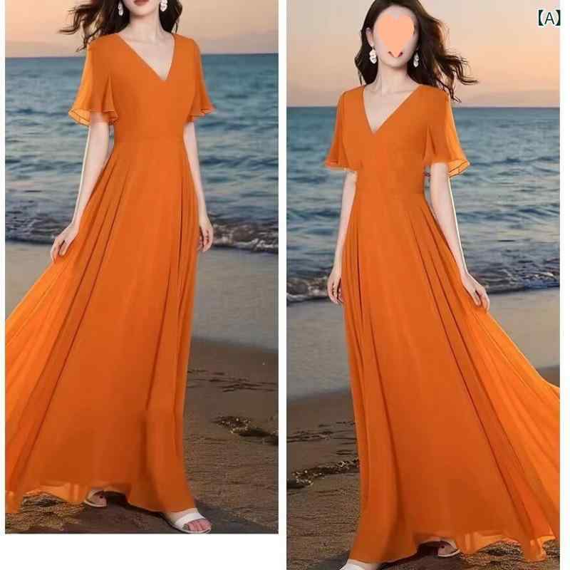ワンピース レディース 春夏 Vネック レディースファッション 続々登場 A:オレンジ色 B:赤 M L XL 2XL 3XL 4XL 5XL