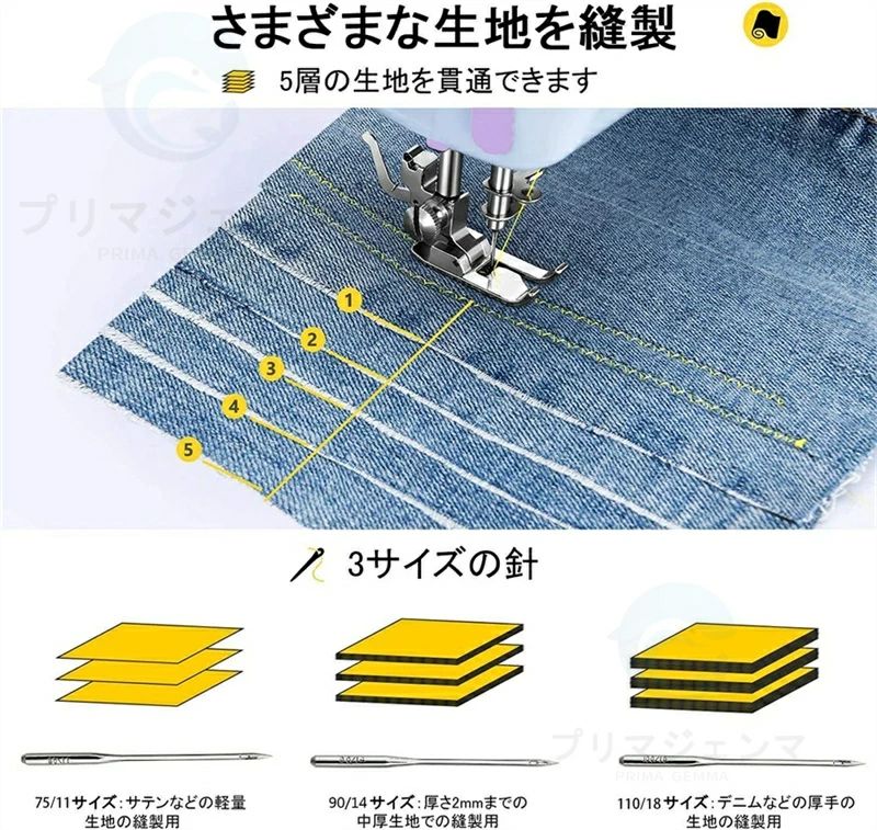 ※厚い布に対応しませんので、無理やり使用すると、上下糸の同期はズレします(大体3枚ジンズ布を重ねる厚さまで)。