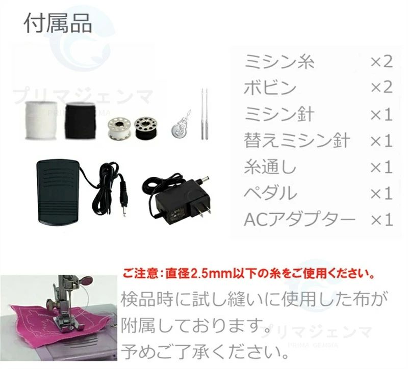 ※試し布が検品で使われて、試し布の上の糸は既に多いので、再び試し布で試す際、線を絡まりやすいです。初めて使用するとき、速やかに試し布を取って、他の布で試してください。