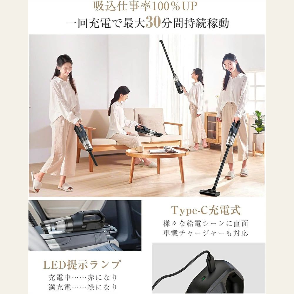 【USB-Type C充電式大容量で26分間連続使用】大容量バッテリーを内蔵し、フル充電で26分間の連続使用時間を実現。 独戸住宅でも独棟でも、どこでも強力な清掃サービスを提供できます。 電池不足を気にせず掃除作業を楽にします。
