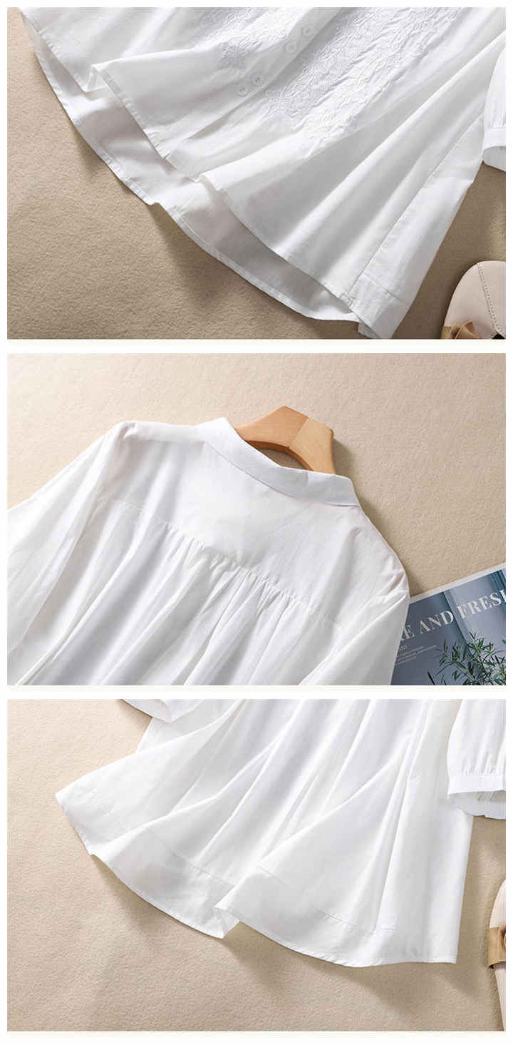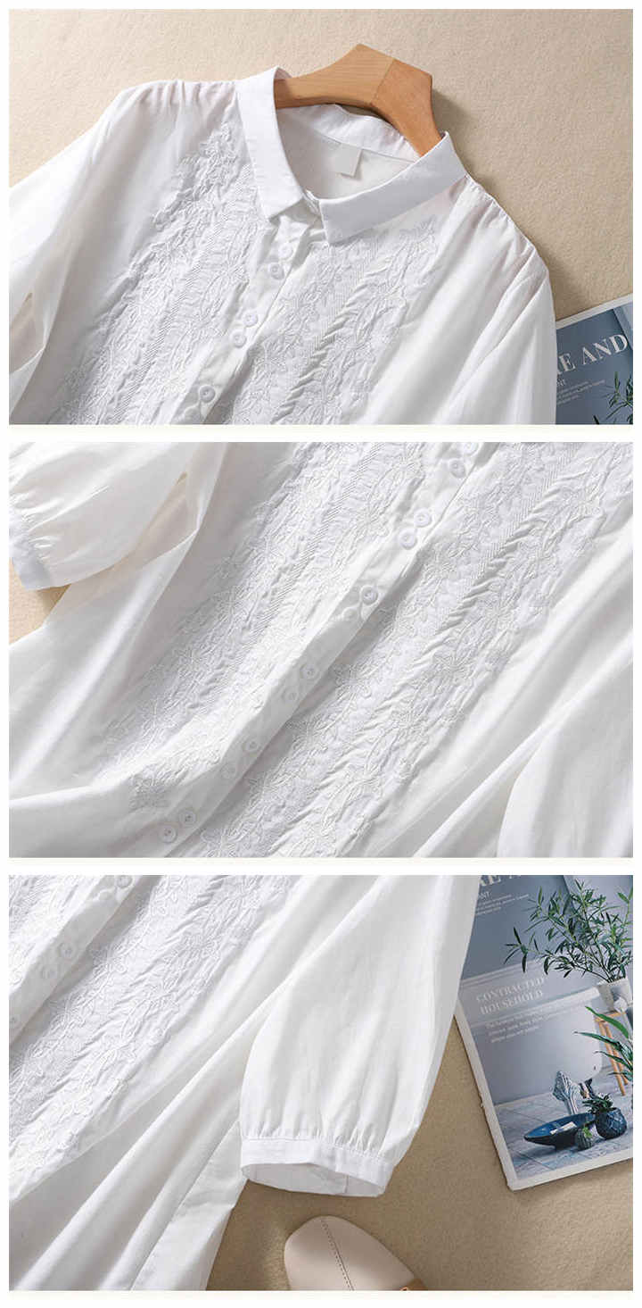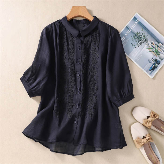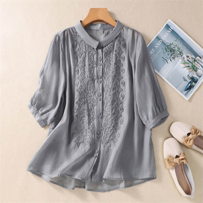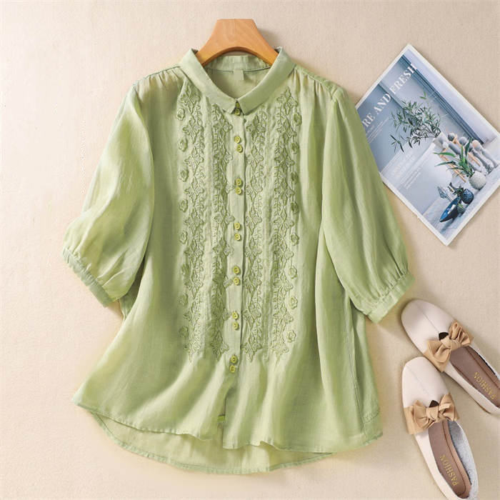 丸襟 シャツ 7分袖 レディース 刺繍 トップス シャツ ブラウス 続々登場 白 グリーン グレー レッド 黒 M L XL 2XL