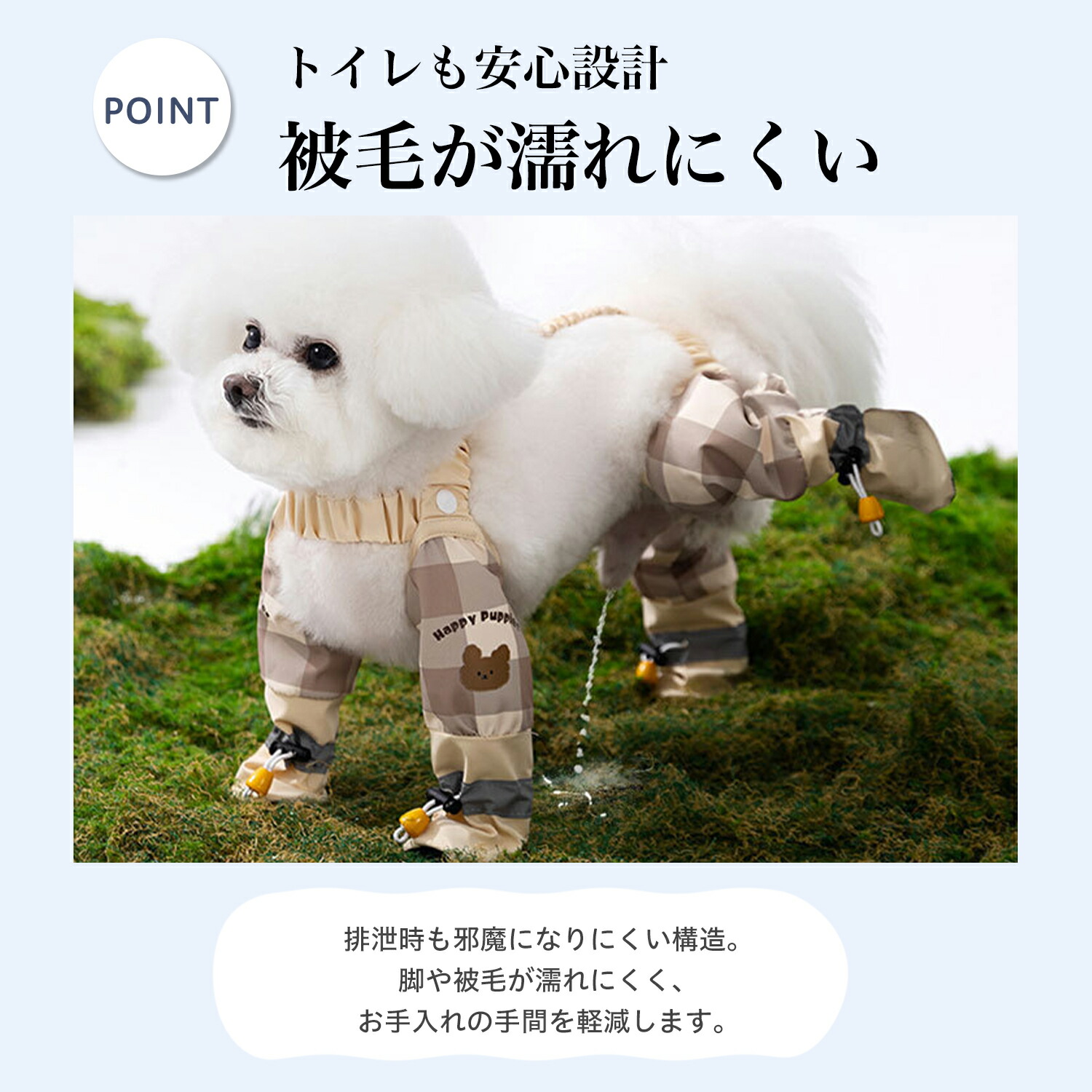 雨の日や雨上がりの散歩、芝生や公園での外遊びで気になる足元の汚れ・濡れ・泥はねを防ぐ、犬用の四足防水ズボンです。