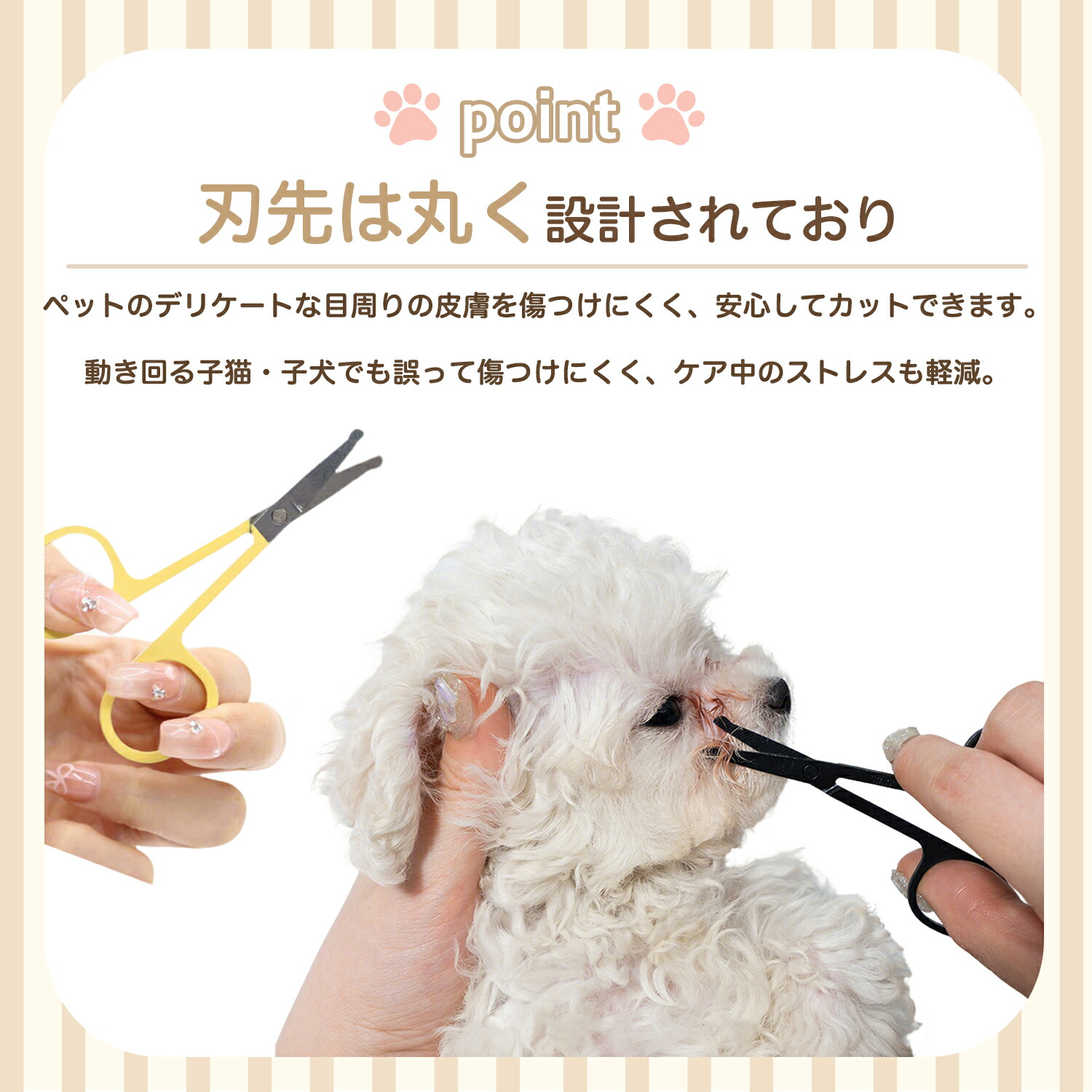 ミニシザーは刃先を丸く加工しており、動きやすい子犬・子猫にも安心して使用可能です。