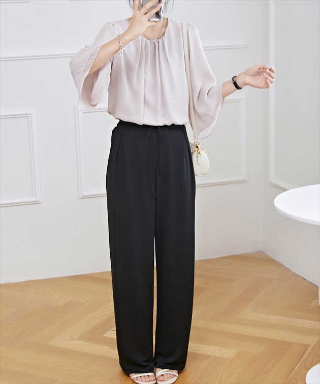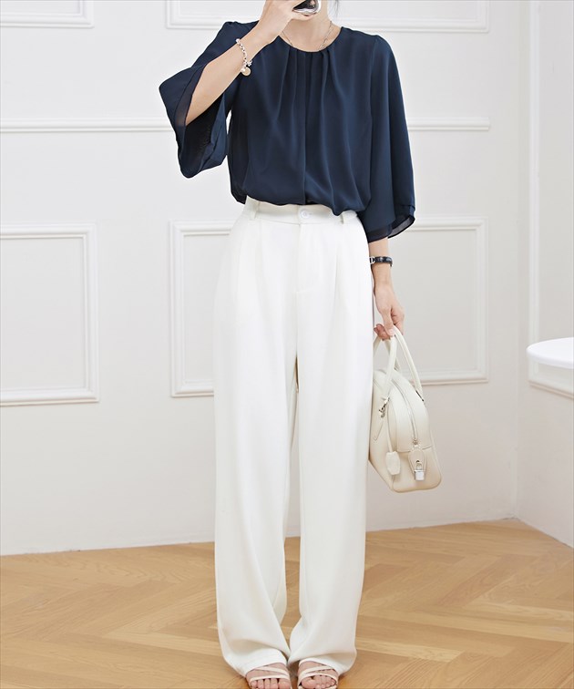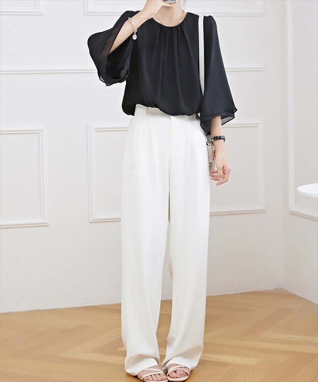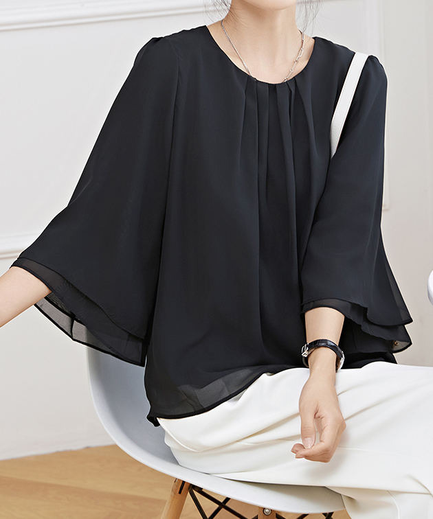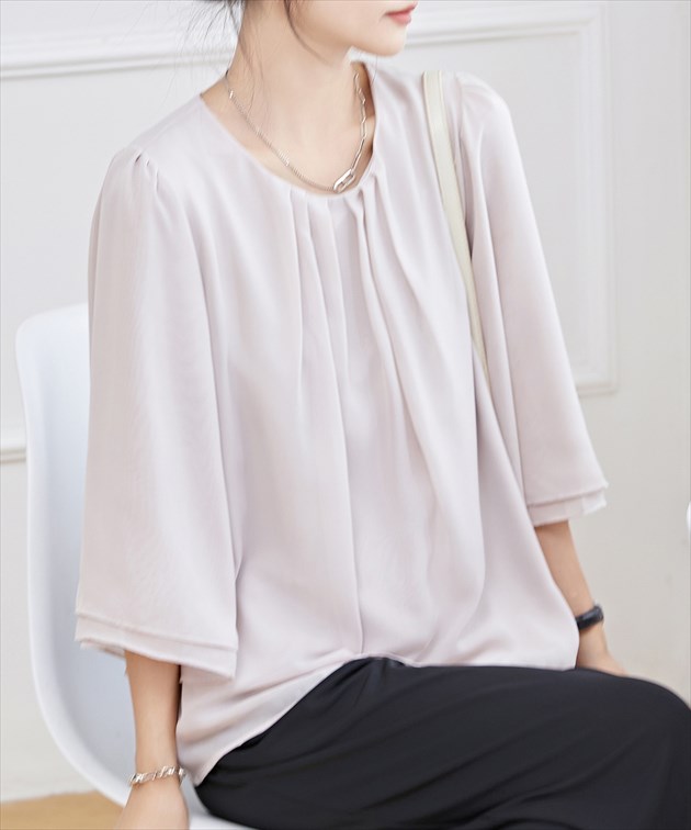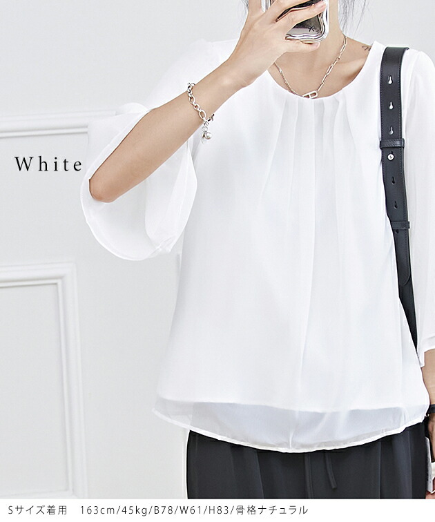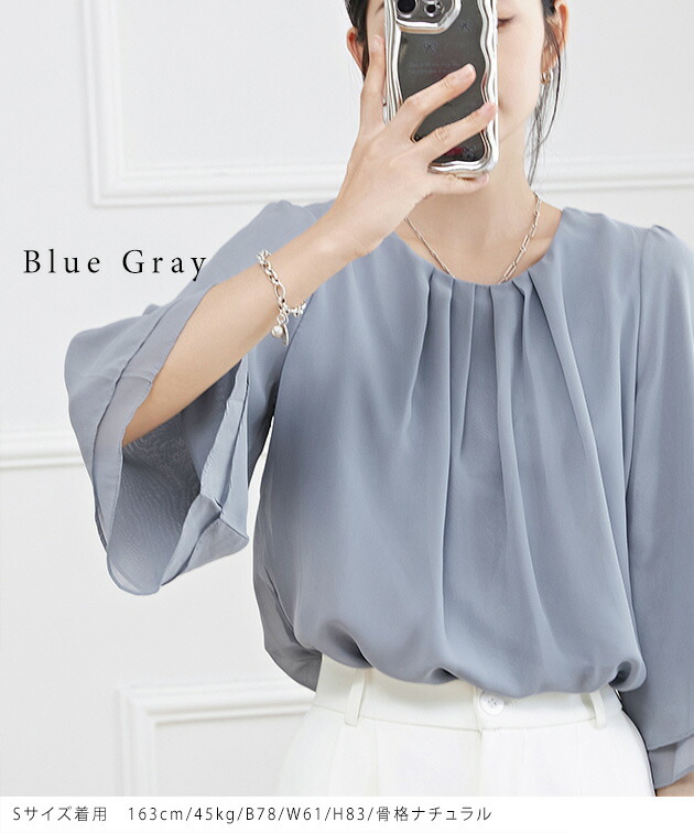 フロントタック シアー 7分袖 フレア レディースファッション 続々登場 ブラック ホワイト ネイビー グレージュ ブルーグレー S F