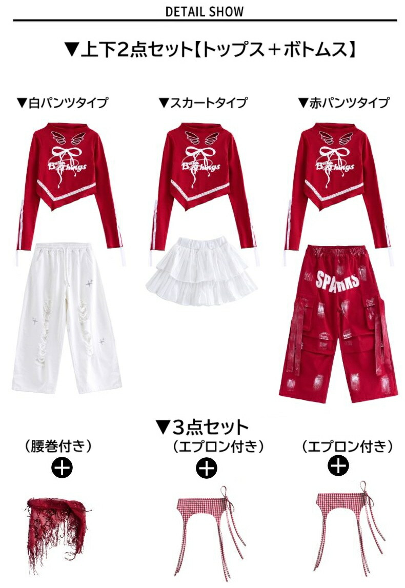 ヒップホップ ダンス衣装 ガールズ K キッズ ベビー マタニティ 早い者勝ち トップス+白パンツ2点set トップス+スカート2点set トップス+赤パンツ2点set 白パンツタイプ3点set(腰巻付き) スカートタイプ3点set(エプロン付) 赤パンツタイプ3点set(エプロン付) トップスのみ 白パンツのみ スカートのみ 赤パンツのみ 110サイズ 120サイズ 130サイズ 140サイズ 150サイズ 160サイズ 170サイズ 180サイズ