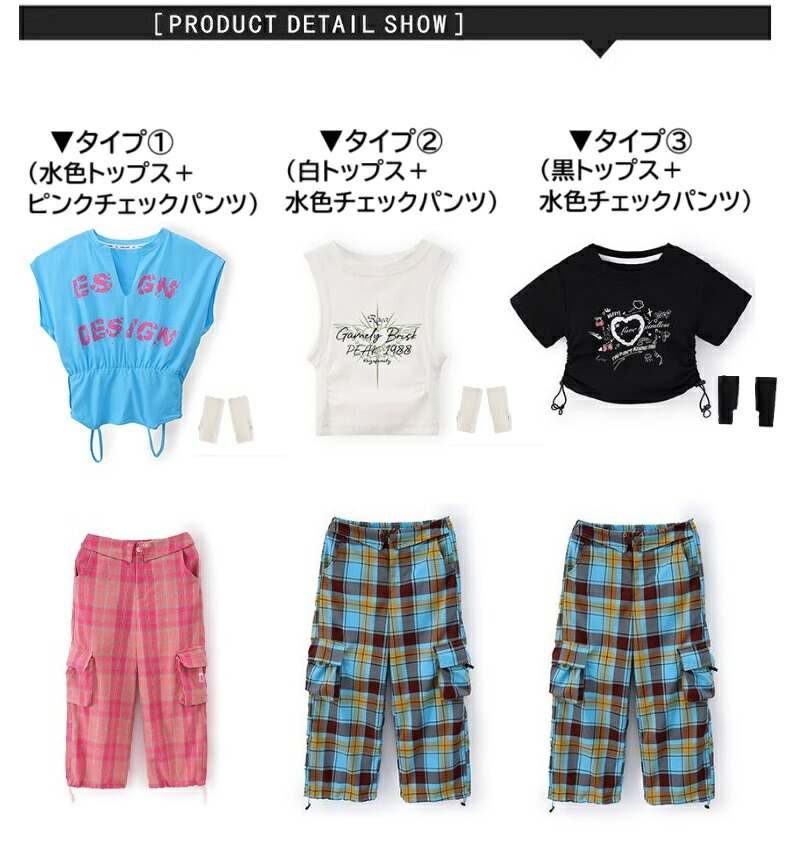 ダンス衣装 キッズ セットアップ チェ 体操 ダンス 社交ダンス ウェア 特集 タイプ1(水色トップス上下3点set) タイプ2(白トップス上下3点set) タイプ3(黒トップス上下3点set) 水色トップス(腕カバー含)のみ 白トップス(腕カバー含)のみ 黒トップス(腕カバー含)のみ ピンクチェックパンツのみ 水色チェックパンツのみ 110サイズ 120サイズ 130サイズ 140サイズ 150サイズ 160サイズ 170サイズ 180サイズ