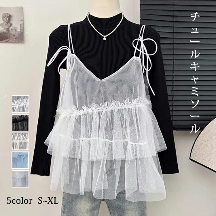 キャミ チュール キャミソール チュニック レディース トップス シアー 透け感 フリル ギャザー ストラップ レイヤード 重ね着 フェミニン カジュアル 春 夏 秋 冬