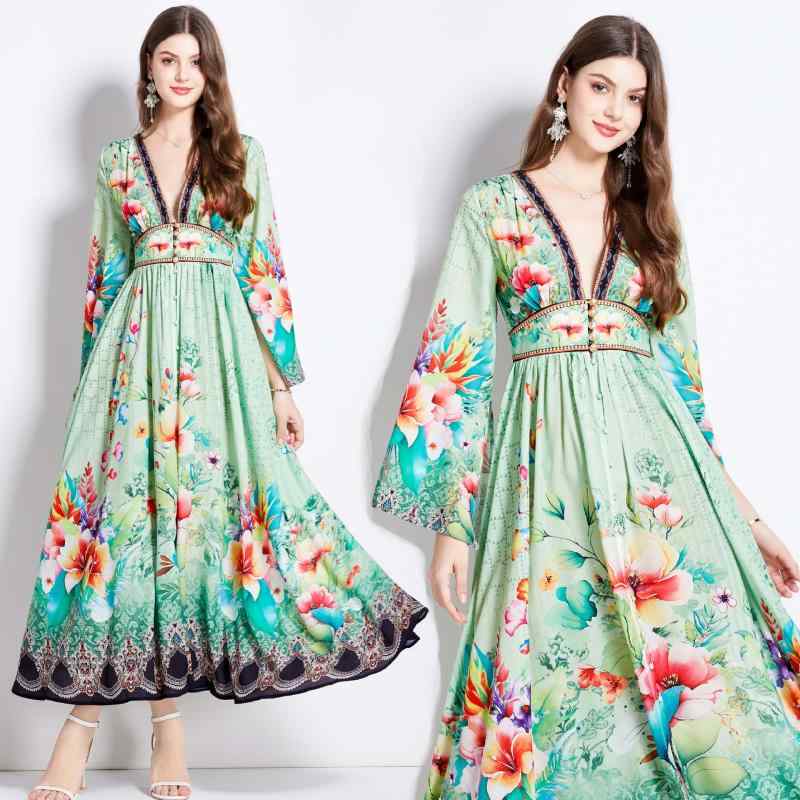 ワンピース レディース 春夏 Vネック 花柄 長袖 ウエストマーク リゾート バカンス 上品 エレガント フレア袖 ライトグリーン クラシカル ドレス ロング丈