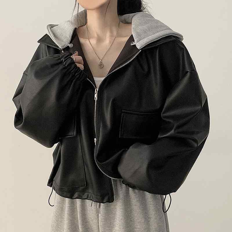 レザージャケット レディース フェイクレザー フード付き ジップアップ ビッグポケット ショート丈 ゆったり ルーズ 韓国風 レトロ 着回し力抜群 秋冬 アウター きれいめカジュアル