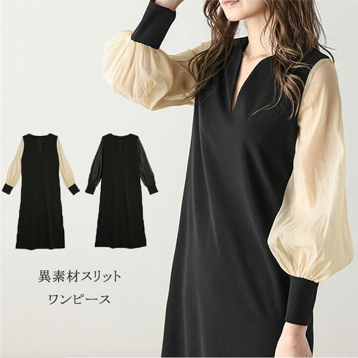 異素材ワンピース スリットワンピース レイヤード感のあるデザイン