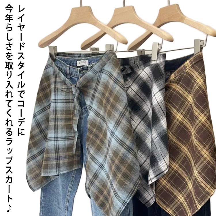 チェック柄ラップスカート レイヤードラップスカート 付け裾 ボトムス 春夏 巻きスカート