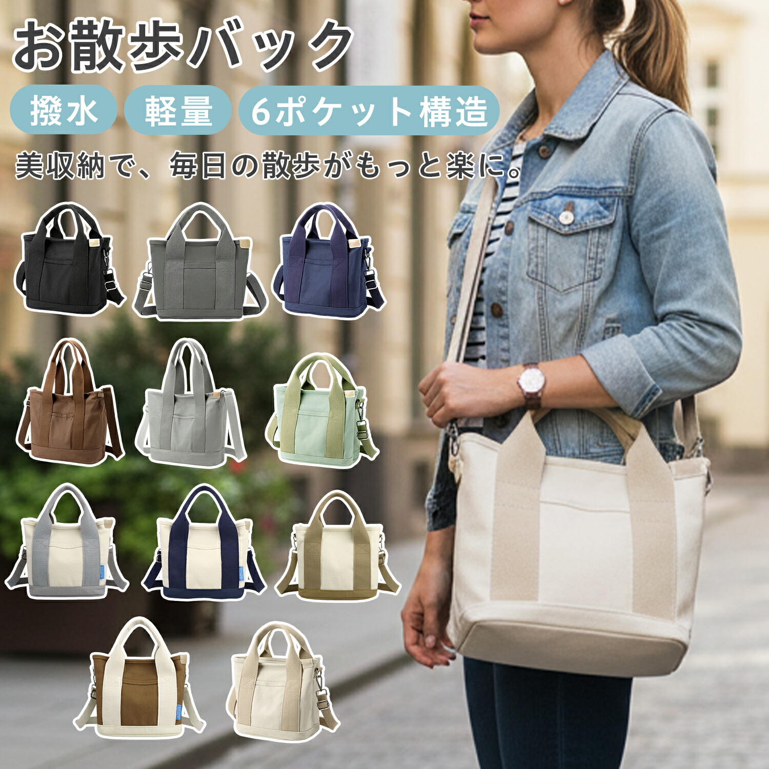 手提げもショルダーもこれ一つで対応でき、荷物がすっきり整う軽くて使いやすい多収納ミニトートバッグ。