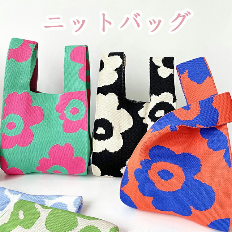 レディース ニットバッグ 手提げ ミニバッグ 花柄 サブバッグ ミニマリスト ブラック ホワイト グリーン ブルー イエロー パープル