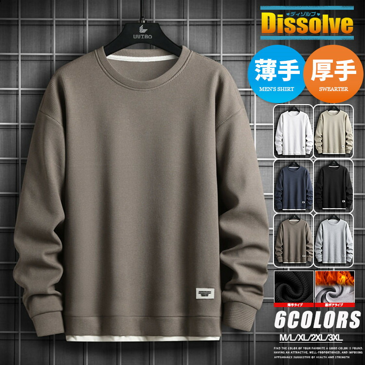 長袖Tシャツ メンズ 無地 ロンT プルオーバー ティーシャツ ワッフル生地 重ね着風 メンズTシャツ 選べる2タイプ 薄手 裏起毛 トップス おしゃれ 春 秋 冬 韓国風 ストリート シン シンプル