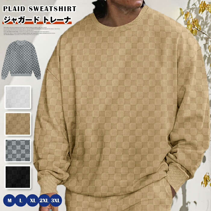 ジャガード トレーナ メンズ クルーネック 長袖トレーナ 長袖 チェック柄 秋 冬 プルオーバー スウェット シャツ トップス 大きいサイズ ゆったり 大人 おしゃれ カジュアル
