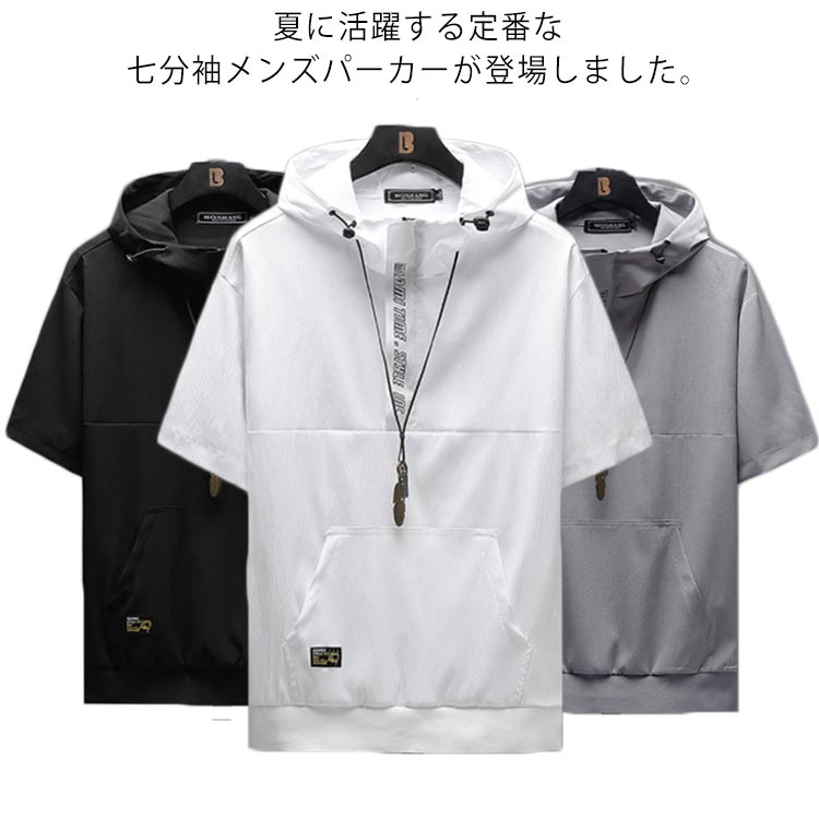 メンズ パーカー 7分袖 夏服 フード付き Tシャツ ゆったり 薄手 おしゃれ プルオーバー 大きいサイズ ジュニア 男の子 かっこいい カットソー カジュアル ポケット付き