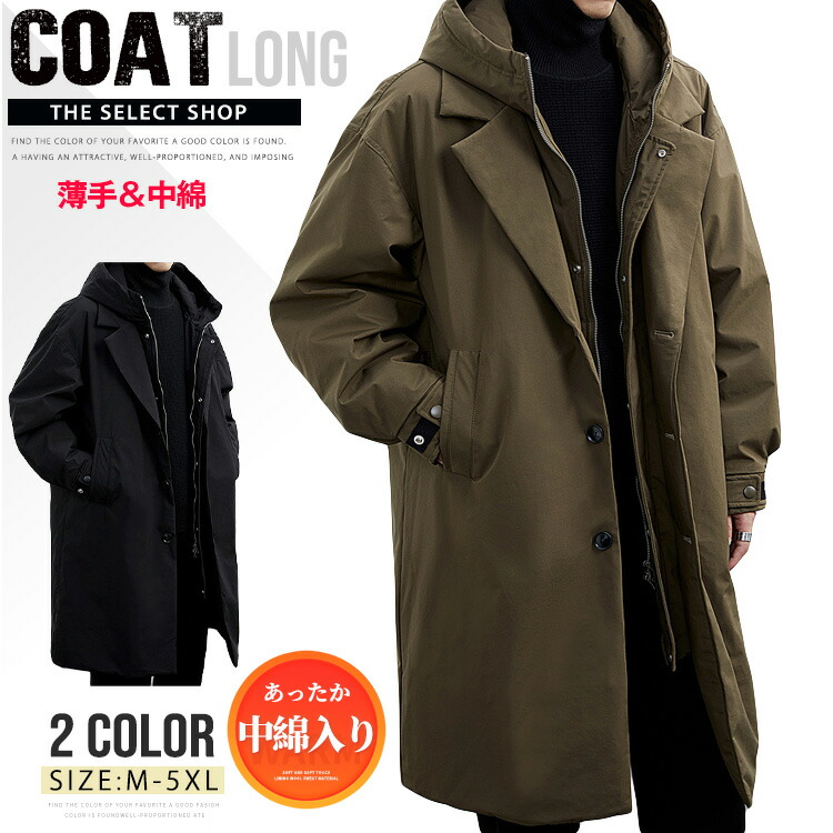 トレンチコート メンズ 綿入り ロングコート ビジネスコート チェスターコート 防寒 コート 厚手コート 大きいサイズ アウター 暖かい 重ね着風 フード付き 秋冬 冬服 薄手 中綿コート 選べ 冬物