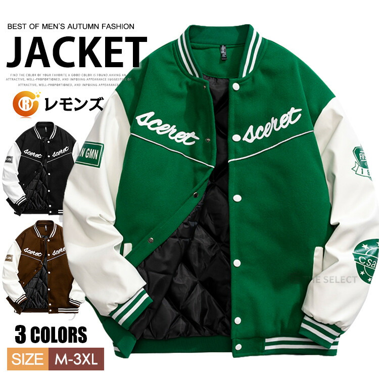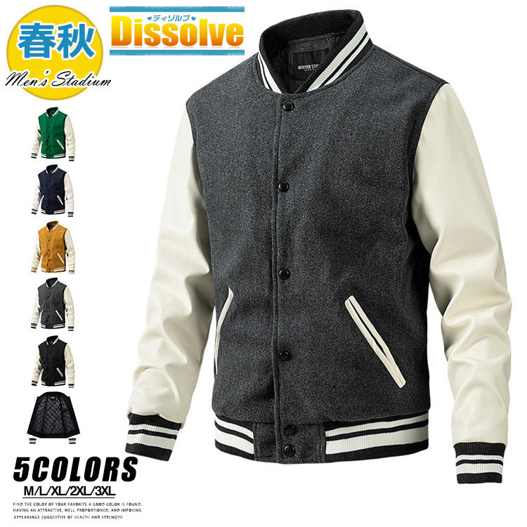 スタジャン 無地 メンズ メルトン ジャケット 中綿 ブルゾン 冬 スタジアムジャンパー 配色 レザー袖 切り替え 野球服 あったか 秋服 冬服 カッコイイ メンズファッション
