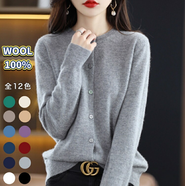 ウール100 カーディガン レディース 秋冬用 洗える クルーネック 長袖 セーター 12色展開 無地シンプル おしゃれ 普段使い 通勤用 ギフトプレゼント対応 暖かい