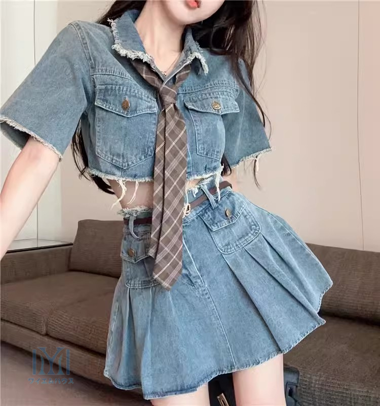 ダンス 衣装 k-pop レディース セットアップ 大人 デニム スカート 半袖トップス 長袖ジャケット セクシー ジャズダンス 普段着可 へそ出し 韓国 ヒップホップ 練習着 hi ファション