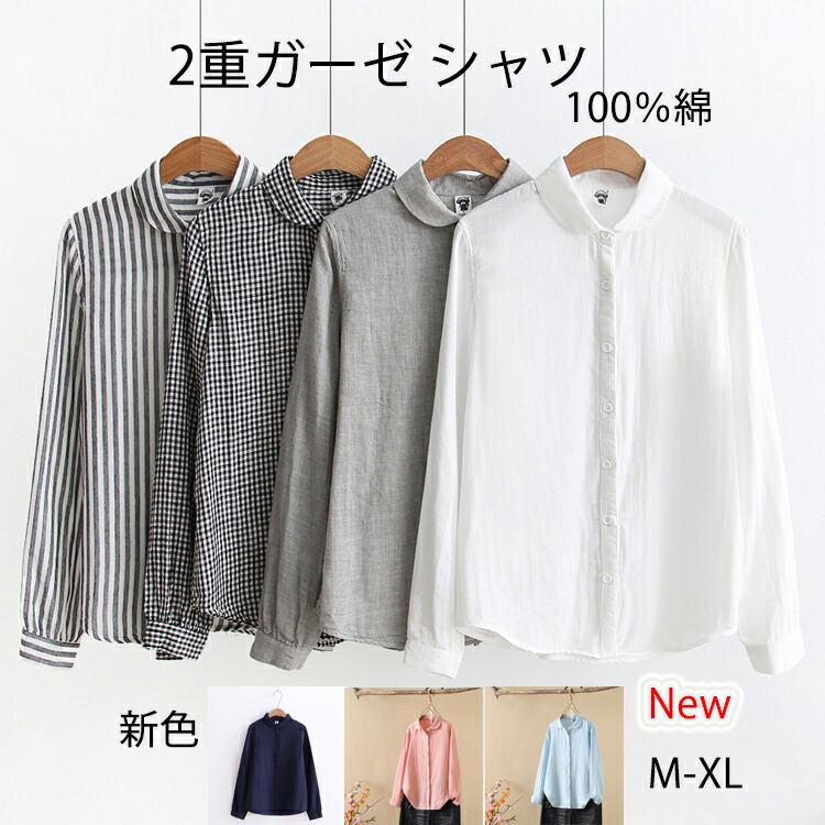 シャツ 長袖 秋 レディース トップス ダブルガーゼ 100%綿 春 春秋 ワイシャツ ガーゼ チェック柄 ストライプ柄 無地 体型カバー ゆったり 前開き 折り襟 コットン 柔らかい 長 オシャレ